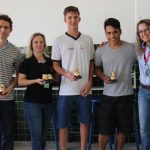 dos alunos Angelo Antonio Cerchiari Vieira, Anísio Sofiatti Neto, Fábio dos Santos da Silveira, Lucas Lehm Oliare e Luiz Colzani Neto, com o trabalho “Gestão de Resíduos na Suinocultura”, sob orientação da Profª Cristiane e do Prof. Fabrício, integrando as disciplinas de Química e Agricultura.