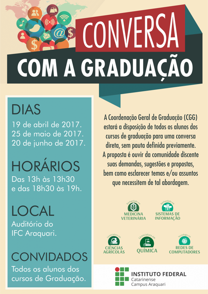 As próximas Conversas com a Graduação acontecerão nos dias 25 de maio e 20 de junho, nos mesmos horários, também no Auditório do IFC Araquari. Os estudantes de todos os cursos superiores estão convidados a participar desse momento de integração e troca de conhecimentos. Uma excelente oportunidade para mostrar seu interesse e conhecer mais sobre a instituição.