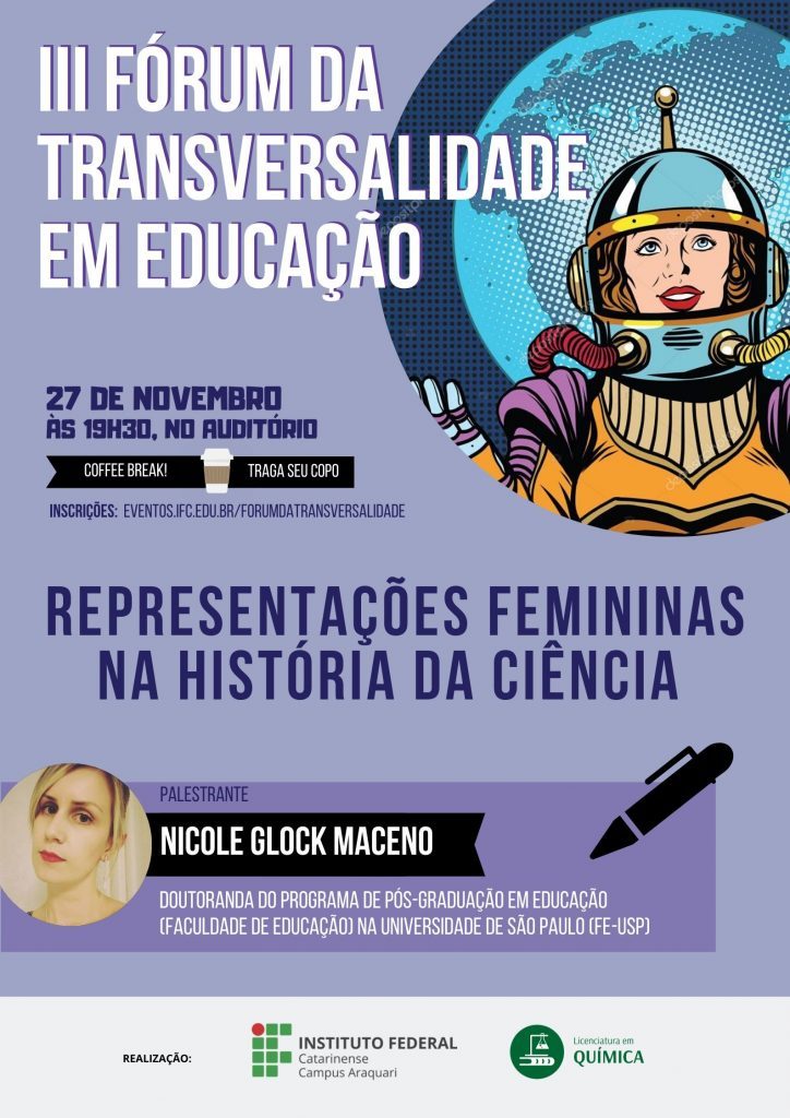 Este fórum se propõe a tratar questões diversas relacionadas à educação, trabalhando a materialização da interdisciplinaridade possibilitada pela abordagem transversal. Nesta edição, o foco principal serão as “Representações femininas na história da ciência“.