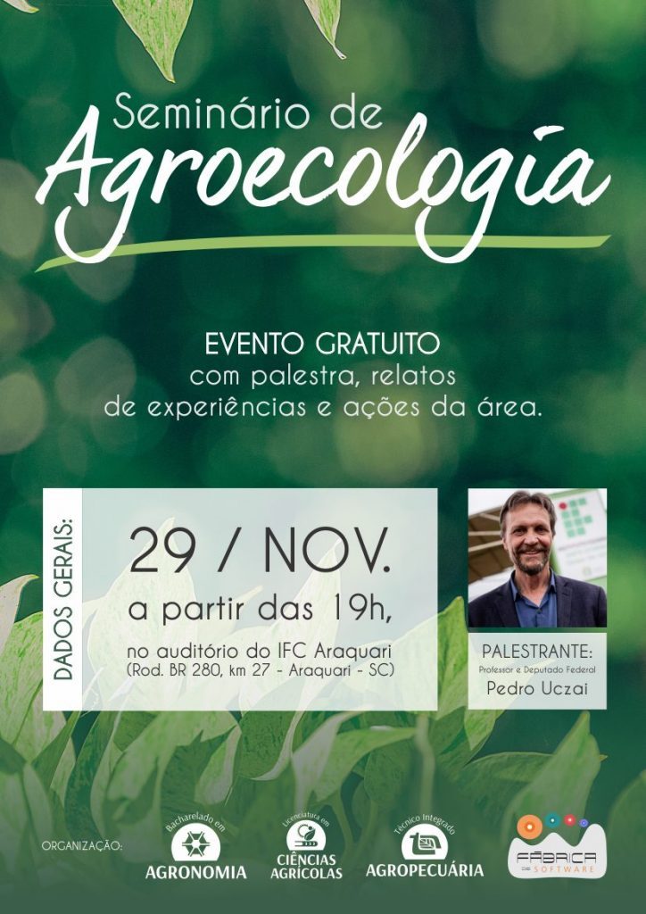 O estudo da agricultura a partir de uma perspectiva ecológica será o tema do próximo seminário que acontecerá no Instituto Federal Catarinense Campus Araquari. O evento denominado Seminário de Agroecologia será realizado dia 29 de novembro, a partir das 19h, no auditório do campus. Não é necessário fazer inscrições, sendo que a participação é gratuita e aberta para toda a comunidade.